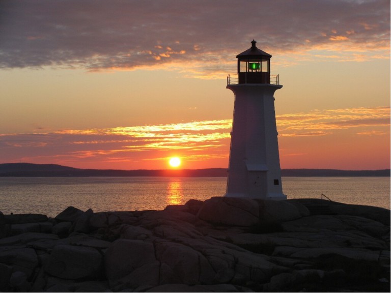 PEGGY’S COVE – We were walking back from dinner, when we heard somebody say “Oh wow! Look at that sunset!” We looked up and the sun was just beginning to set behind the lighthouse, so we sat down on the rocks, along with everybody else; as the sun dropped slowly behind the horizon, the sky turned all hues of oranges and yellows, and from further up on the rocks, a lone fiddler stood and played Celtic music until the last light was gone. It was one of those truly magical moments in time.