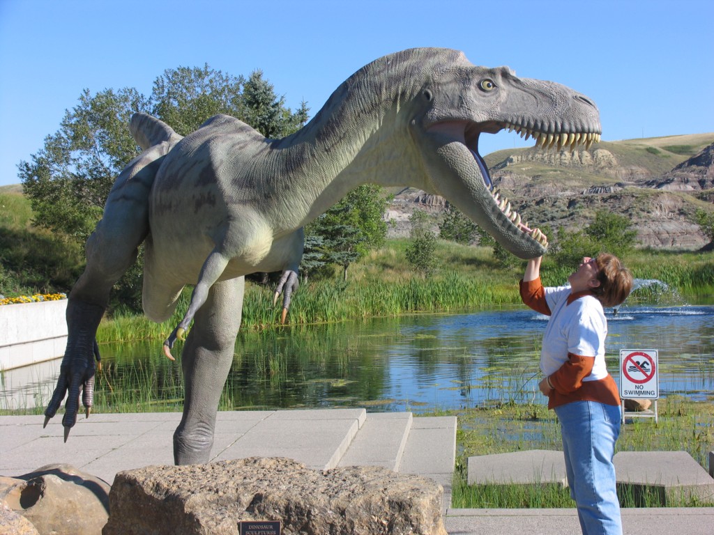 TYRRELL DINOSAUR MUSEUM, Drumheller, Alberta – This wonderful museum is located in the badlands of the Red Deer River Valley, surrounded by one of the richest fossil deposits in the world. In this photo, I’m discovering that at least one dinosaur didn’t have dental coverage way back then.