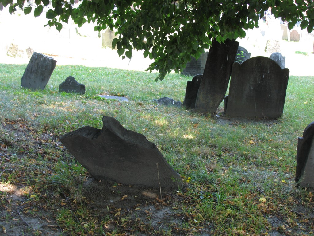 COPPS HILL BURIAL GROUND, near the Old North Church, Boston, Mass. Founded in 1659 this is the second oldest burying ground in the city. Note how many of the tombstones and slabs appear disheveled. Our tour guide informed us that many of the bodies beneath the tombstones do not match up with the names on the markers!